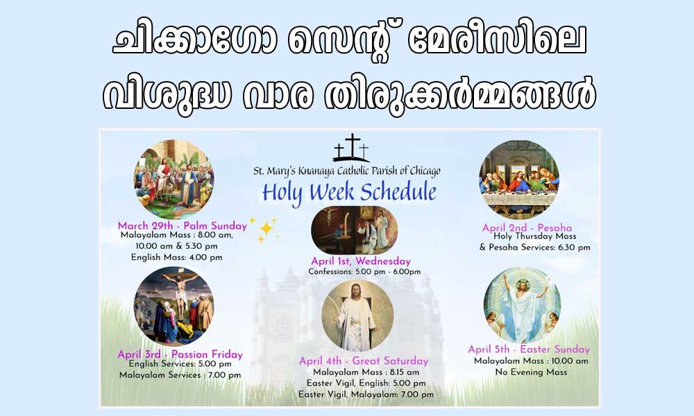 ചിക്കാഗോ: യേശുക്രിസ്തുവിന്റെ രാജകീയമായ ജറൂസലേം പ്രവേശനം, പീഢാനുഭവം, കുരിശുമരണം, ഉയർത്തെഴുന്നേല്പ് എന്നിവ അനുസ്മരിക്കുന്ന വിശുദ്ധ വാരത്തിലേക്കു ലോകമെമ്പാടുമുള്ള ക്രൈസ്തവരോടൊപ്പം മോർട്ടൻ ഗ്രോവ് സെന്റ് മേരീസ് ക്നാനായ കത്തോലിക്ക ദേവാലയവും പ്രവേശിക്കുന്നു. വിശുദ്ധ വാരത്തിലെ തിരുക്കർമ്മങ്ങൾ താഴെപ്പറയുന്ന ക്രമത്തിൽ നടക്കുന്നതാണ്.