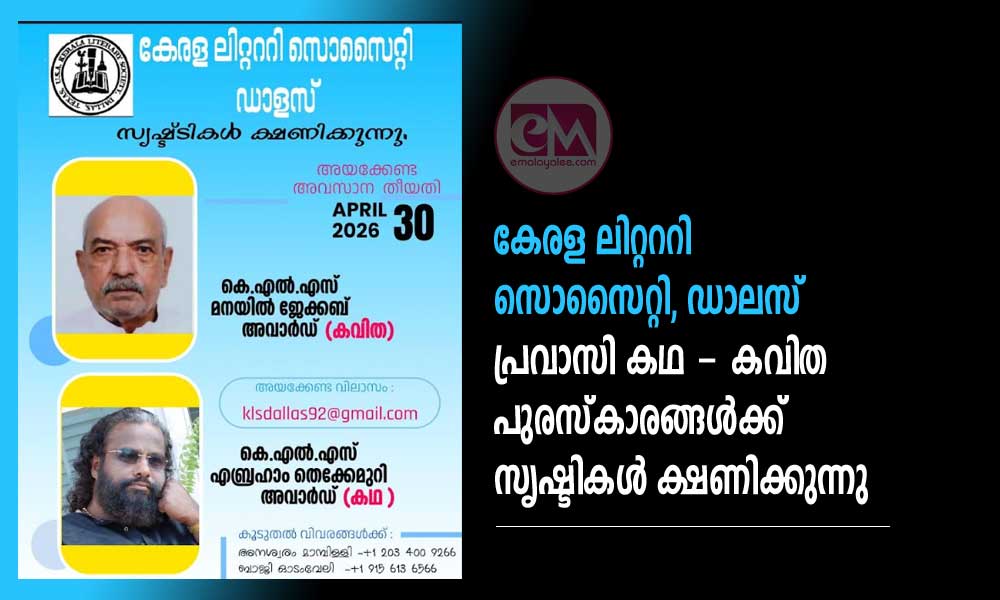 ഡാലസ് : അമേരിക്കയിൽ സർഗ വാസനയുള്ള മലയാളി എഴുത്തുകാരെ പ്രോത്സാഹിപ്പിക്കാനായി 1992 ൽ ഡാലസിൽ ആരംഭിച്ച എഴുത്തുകാരുടെയും സാഹിത്യ ആസ്വാദകരുടെയും സംഘടനയായ കേരള ലിറ്റററി സൊസൈറ്റി പ്രവാസി ഇന്ത്യക്കാർക്കായി ഏർപ്പെടുത്തിയിരിക്കുന്ന പ്രവാസി കഥ - കവിത പുരസ്കാരങ്ങൾക്ക് സൃഷ്ടികൾ ക്ഷണിക്കുന്നു. 25,000 രൂപയും പ്രശസ്തി പത്രവും അടങ്ങുന്നതാണ് രണ്ട് അവാർഡുകളും.