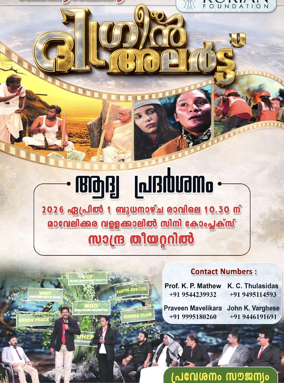 “ദി ഗ്രീൻ അലേർട്ട്” ഹ്രസ്വചിത്രത്തിന്റെ ആദ്യ പ്രദർശനം 2026 ഏപ്രിൽ 1-ന് രാവിലെ 10.30-ന് മാവേലിക്കര സാന്ദ്ര തിയേറ്ററിൽ നടക്കും. പ്രവേശനം സൗജന്യമാണ്.