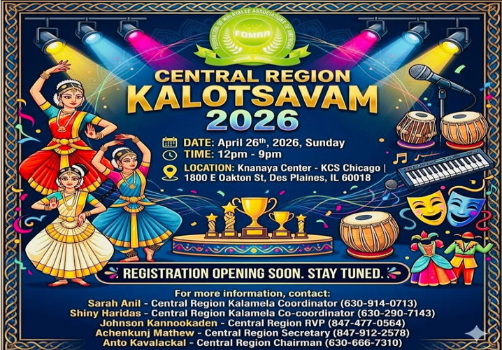 ചിക്കാഗോ : ഫോമാ സെന്ട്രല് റീജിയന്റെ ആഭിമുഖ്യത്തിലുള്ള ഈ വര്ഷത്തെ കലാമേള, ഡെസ്പ്ലെയിന്സിലുള്ള ക്നാനായ കമ്മ്യൂണിറ്റി സെന്ററില് വച്ച് 2026 ഏപ്രില് 26ന് നടത്തപ്പെടുന്നതാണ്. കലാമേളയുടെ വിജയകരമായ നടത്തിപ്പിനായി വിവിധ കമ്മിറ്റികള് രൂപീകരിച്ചു.