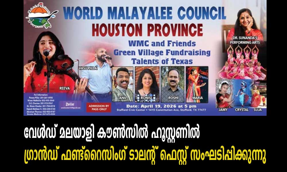 ഹൂസ്റ്റൺ, ടെക്സസ്- 2026 ഏപ്രിൽ 19 ഞായറാഴ്ച പ്രശസ്തമായ സ്റ്റാഫോർഡ് സിവിക് സെന്ററിൽ നടക്കുന്ന കിടിലോൽക്കിടിലമായ ഫണ്ട്റൈസിംഗ് ടാലന്റ് ഫെസ്റ്റ് വേൾഡ് മലയാളി കൗൺസിൽ അഭിമാനത്തോടെ നിങ്ങളുടെ ശ്രദ്ധയെ ക്ഷണിക്കുന്നു.