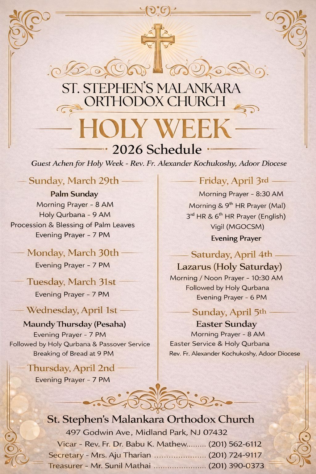 സെന്റ് സ്റ്റീഫന്‍സ്  ദേവാലയ വികാരി റവ:ഫാ.ഡോ. ബാബു .കെ.മാത്യു എല്ലാ വിശ്വാസികളും സെന്റ്  സ്റ്റീഫന്‍സ്  ഓര്‍ത്തഡോക്ള്‍സ് ദേവാലയത്തില്‍  നടക്കുന്ന വിശുദ്ധ കഷ്ടാനുഭാഴ്ച  ശ്രുശൂഷകളില്‍  പങ്കെടുത്ത്  അനുഗ്രഹം പ്രാപിക്കണം എന്ന് പ്രത്യേകം ഓര്‍മിപ്പിച്ചു.