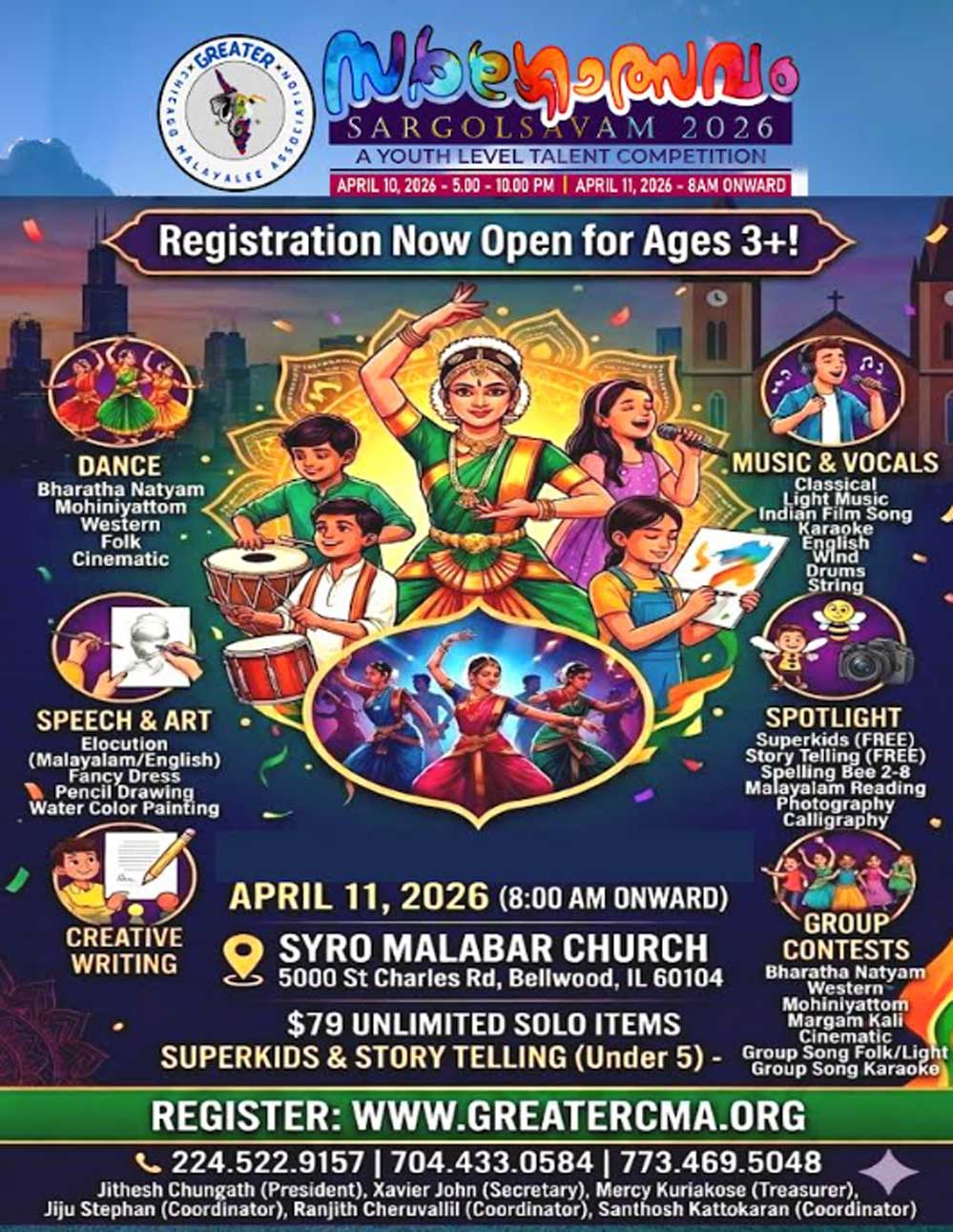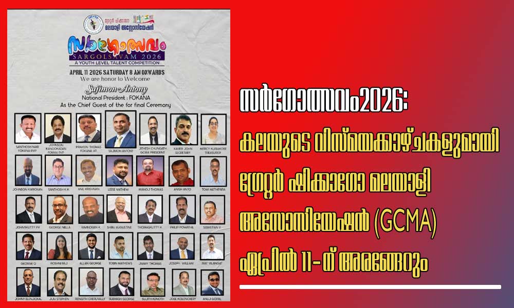 ഗ്രേറ്റർ ഷിക്കാഗോ മലയാളി അസോസിയേഷൻ (GCMA) സംഘടിപ്പിക്കുന്ന വിപുലമായ യുവജനോത്സവം 'സർഗോത്സവം 2026' ഏപ്രിൽ 11-ന് നടക്കും. 3 വയസ്സു മുതൽ 18 വയസ്സു വരെയുള്ള കുട്ടികൾക്കായി വിവിധ വിഭാഗങ്ങളിലായാണ് മത്സരങ്ങൾ ക്രമീകരിച്ചിരിക്കുന്നത്. ഷിക്കാഗോയിലെയും പരിസരപ്രദേശങ്ങളിലെയും പ്രതിഭകളായ കുട്ടികൾക്കും യുവാക്കൾക്കും തങ്ങളുടെ കലാവൈഭവം പ്രകടിപ്പിക്കാനുള്ള മികച്ച വേദിയായി സർഗോത്സവം മാറും.