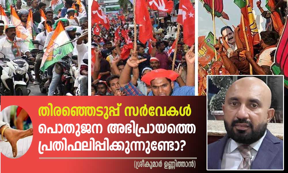 കേരളത്തിലെ തിരഞ്ഞെടുപ്പ് സർവേകളെ വിശ്വസിക്കാമോ എന്നത് പലപ്പോഴും ചർച്ച ചെയ്യപ്പെടുന്ന വിഷയമാണ്. സർവേകളെ ചില പാർട്ടികൾ അവരുടെ അജണ്ടയുടെ ഭാഗമായി അവതരിപ്പിക്കുമ്പോൾ അവ പൊതുജന അഭിപ്രായത്തെ പ്രതിഫലിക്കുന്നുണ്ടോ? ഓരോ രാഷ്ട്രീയ പാർട്ടിയും അഭിപ്രായ സര്വേകള് നടത്തുകയും തങ്ങൾക്കു അനുകൂലമായി വിധി പറയുകയും ചെയ്യുബോൾ പൊതുജനം തന്നെ ഏത് ശരി ഏത് തെറ്റ് എന്ന് തിരിച്ചറിയുവാൻ ബുദ്ധിമുട്ടുന്നു.