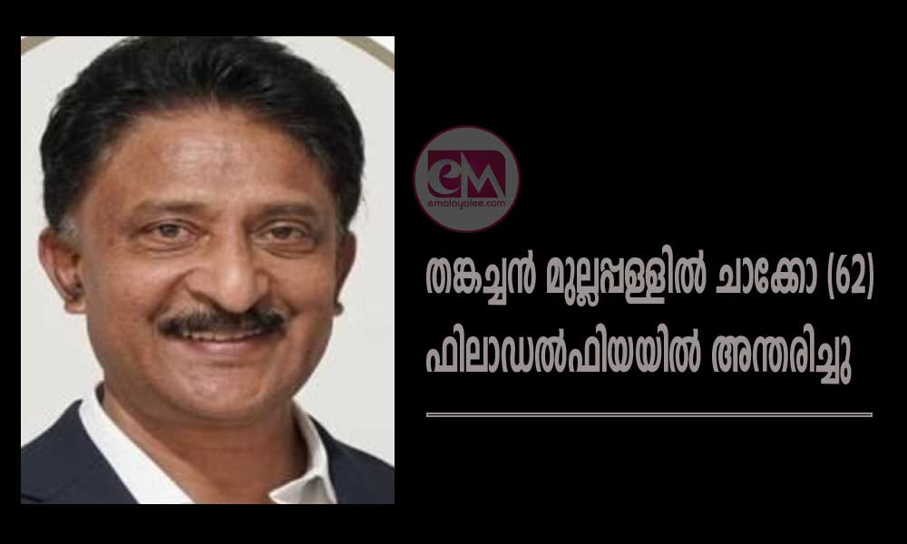 ഫിലാഡൽഫിയ: തങ്കച്ചൻ മുല്ലപ്പള്ളിൽ ചാക്കോ (62) ഫിലാഡൽഫിയയിൽ അന്തരിച്ചു. പരേതൻ സിറ്റി ഓഫ് ഫിലാഡൽഫിയ ട്രാഫിക് ഡിപ്പാർട്മെന്റിൽ ടെക്നീഷ്യനായി സേവനം അനുഷ്ഠിച്ചു വരികയായിരുന്നു. ഒരാഴ്ചയായി ടെംപിൾ ഹോസ്പിറ്റലിൽ ചികിത്സയിൽ ആയിരുന്ന അദ്ദേഹം ഈ കഴിഞ്ഞ വെള്ളിയാഴ്ചയാണ് ലോകത്തോട് വിട പറഞ്ഞത്.