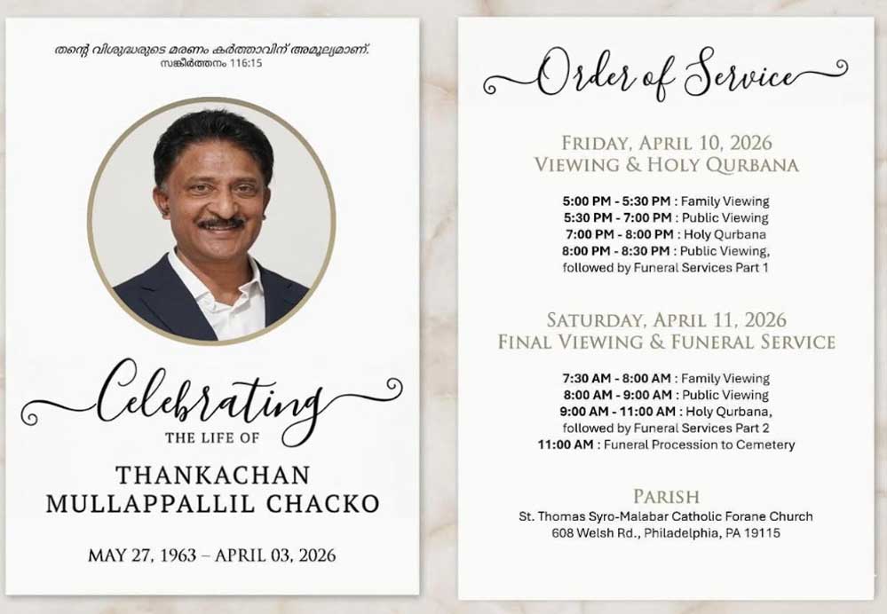Funeral service 9:00 a.m. – 11:00 a.m. (Holy Qurbana)