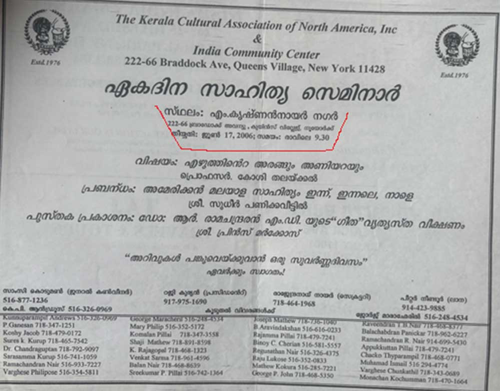 ('കേരള കള്ച്ചറല് അസ്സോസിയേഷന്, 222 ബ്രാഡൊക്ക് അവന്യു, നൂയോര്ക്ക്, ജൂണ് 17, 2006 ശനിയാഴ്ച്ച സംഘടിപ്പിച്ച ''ഏക ദിന സെമിനാറില്' അവതരിപ്പിച്ചത്