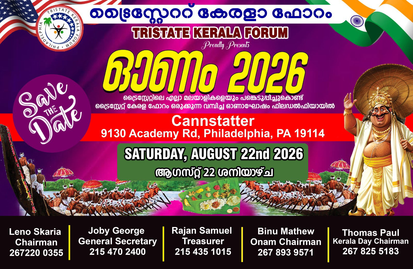ഫിലാഡൽഫിയ: ട്രൈസ്റ്റേറ്റ് കേരള ഫോറത്തിന്റെ നേതൃത്വത്തിൽ ഈ വർഷത്തെ ഓണം ആഘോഷം ആഗസ്റ്റ് 22-ാം തീയതി ശനിയാഴ്ച ഫിലഡൽഫിയയിലെ കാൻസ്റ്റാറ്റർ വോൾക്സ്ഫെസ്റ്റ് വെറൈൻ (Cannstatter), 9130 Academy Road, PA 19114 ഓഡിറ്റോറിയത്തിൽനടത്തപ്പെടുമെന്ന് സംഘാടക സമിതി അറിയിച്ചു.