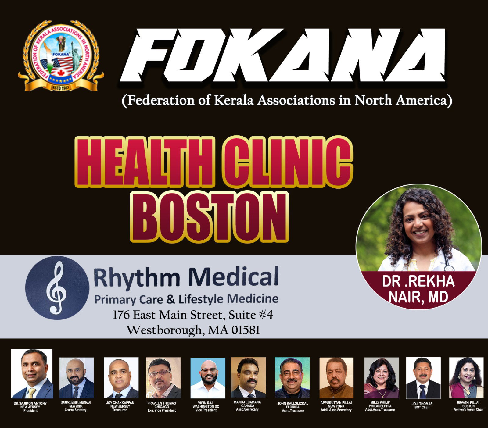 ഫൊക്കാനയുടെ ഡ്രീം പ്രൊജെക്ടുകളിൽ ഒന്നായ ഫൊക്കാന ഹെൽത്ത് ക്ലിനിക്ക് അമേരിക്കയിൽ ഉടനീളം ഓഫീസുകൾ തുറന്നു വരുകയാണ് . നാട്ടിൽ നിന്നും വരുന്ന ഇൻഷുറൻസ് പരിരക്ഷയില്ലാത്ത ആളുകൾക്കും അതുപോലെ അമേരിക്കയിലുള്ള ഇൻഷുറൻസ് പരിരക്ഷയില്ലാത്ത മലയാളികൾക്ക് ബേസിക് ചികിത്സ നൽകുക എന്ന ലക്ഷ്യത്തോട് ആണ് ഫൊക്കാന ഹെൽത്ത് ക്ലിനിക്ക് നിലവിൽ വന്നിരിക്കുന്നത് .ബോസ്റ്റൺ ഓഫീസ് ഡോ . രേഖ നായരുടെ ഓഫീസ് ആയ Rhythm Medical (176 East Main Street ,Suite #4, Westborough , MA 01581 ) തന്നെയാണ് പ്രവർത്തിക്കുന്നത്