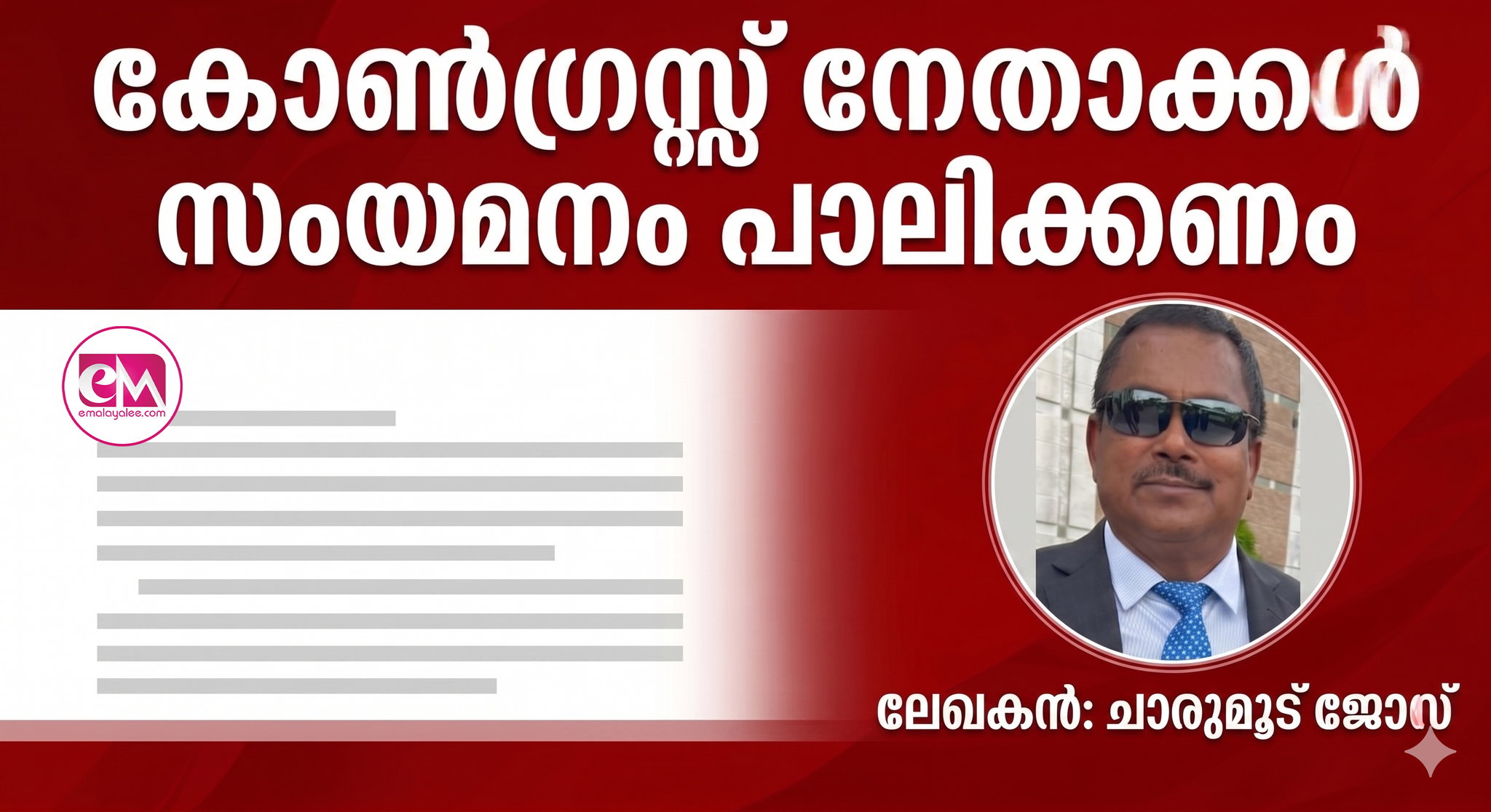 കേരളത്തിലെ കോണ്ഗ്രസ്സ് പാര്ട്ടിക്ക് നേതാക്കന്മാരെകൊണ്ട് പൊറുതിമുട്ടിയിരിക്കുകയാണ്. നേതാക്കന്മാരുടെ ബാഹുല്യം പാര്ട്ടി പ്രവര്ത്തകര്ക്ക് മൊത്തം ജനങ്ങള്ക്കും പാര്ട്ടിയോടുള്ള താല്പര്യം കുറയാനിടയാകരുത്. ശക്തമായ നിയന്ത്രണങ്ങള് അനിവാര്യമായിരിക്കയാണ്. എല്ലാവരും സംയമനം പാലിക്കണം. സ്വയം ഗോളടിക്കുന്ന പരിപാടികള് എത്രയും പെട്ടെന്ന് അവസാനിപ്പിച്ച് അച്ചടക്കബോധത്തോടുകൂടി ഉത്തരവാദിത്വ മനോഭാവത്തോടുകൂടി ഉത്തരവാദിത്വ മനോഭാവത്തോടെ മുമ്പോട്ടു പോയാലേ പ്രവര്ത്തകരുടെയും ആകമാനം കേരളത്തിലെ ജനങ്ങളുടെയും മനോവീര്യം കാത്തുസൂക്ഷിക്കാന് പറ്റുകയുള്ളൂ.
