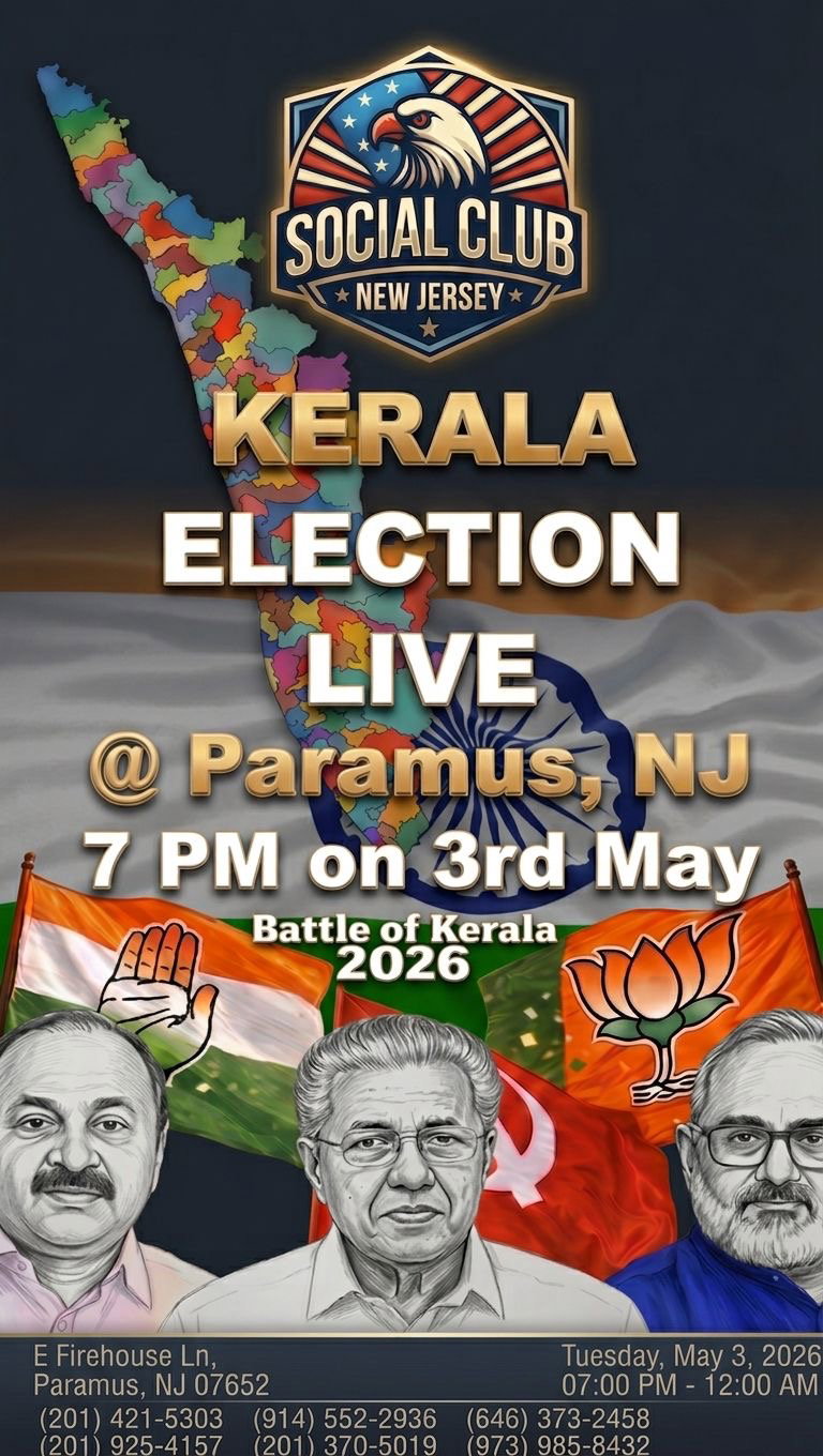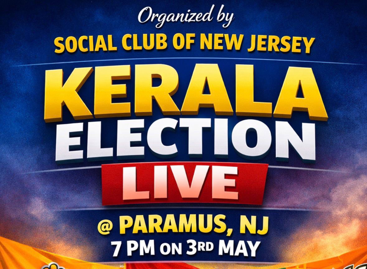 ന്യൂ ജേഴ്സി സോഷ്യല് ക്ലബിന്റെ ആഭിമുഖ്യത്തില് കേരളാ ഇലക്ഷന് റിസള്ട്ട് വാച്ച് നൈറ്റ് ലൈവ് മെയ് 3 ന് വൈകുന്നേരം 7 മണിക്ക്. കേരളത്തില് അരങ്ങേറുന്ന നിയമസഭാ തിരഞ്ഞെടുപ്പിന്റെ ഫലങ്ങള് നേരിട്ട് കാണുന്നതിനാണ് ന്യൂ ജേഴ്സി സോഷ്യല് ക്ലബ് അവസരമൊരുക്കുന്നത്.