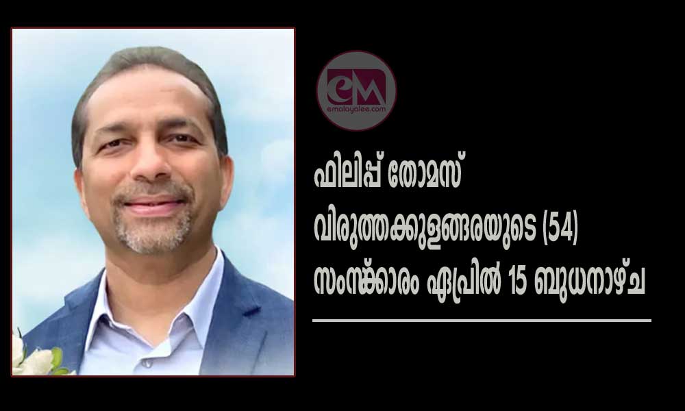 ചിക്കാഗോ: ചിക്കാഗോയിൽ അന്തരിച്ച ഫിലിപ്പ് തോമസ് വിരുത്തക്കുളങ്ങരയുടെ (54) സംസ്ക്കാരം ഏപ്രിൽ 15 ന് ബുധനാഴ്ച നടത്തപ്പെടും. മോർട്ടൻ ഗ്രോവ് സെൻ്റ് മേരീസ് ക്നാനായ കാത്തലിക് പള്ളിയിൽ രാവിലെ 7:30 മുതൽ 10: 30 വരെ പൊതുദർശനം. തുടർന്ന് ദിവ്യബലിയും, പ്രാർത്ഥനാ ശുശ്രൂഷകളും.നൈൽസിലുള്ള മേരിഹിൽ കാത്തലിക് സെമിത്തേരിയിൽ സംസ്കാരം നടക്കും