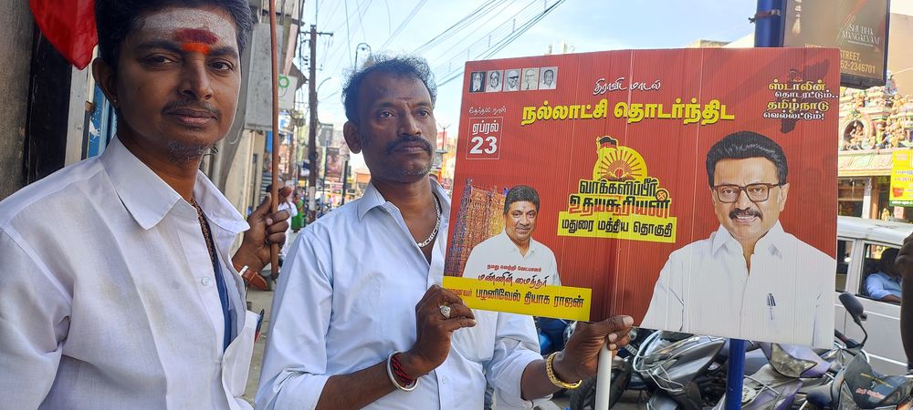 ഏപ്രിൽ 23നു നടക്കുന്ന സംസ്ഥാന നിയമസഭാ തെരഞ്ഞെടുപ്പിന്റെ പ്രചാരണത്തിൽ കേരളത്തിന്റെയത്ര വെറും വാശിയും കണ്ടില്ലെങ്കിലും ഭരണകക്ഷിയായ ഡിഎംകെയുടെ ചെറിയൊരു സംഘം കൊടിയും പ്ലക്കാർഡും പിടിച്ച് വീടുവീടാന്തരം കയറിയിറങ്ങുന്നതു കണ്ടു. മൊബൈലിൽ ഫോട്ടോ എടുക്കാൻ തുനിഞ്ഞപ്പോൾ അവർ പ്ലക്കാർഡ് ഉയർത്തി പോസ് ചെയ്തു. പ്ലക്കാർഡിൽ മുഖ്യമന്ത്രി സ്റ്റാലിനോടൊപ്പം മധുര സെൻട്രലിൽ മൂന്നാമതു മത്സരിക്കുന്ന മന്ത്രി ത്യാഗരാജന്റെ ചിത്രവും.