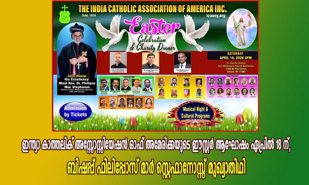 ന്യൂ യോർക്ക് : ഇന്ത്യാ കാത്തലിക് അസ്സോസ്സിയേഷൻ ഓഫ് അമേരിക്കയുടെ 47 മത് ഈസ്റ്റർ ആഘോഷം ഏപ്രിൽ18 ശനിയാഴ്ച വൈകിട്ട് അഞ്ച് മണി മുതൽ ലോങ്ങ് ഐലൻഡ്, എൽമോണ്ട് സെന്റ് വിൻസെന്റ് ഡി പോൾ മലങ്കര കാത്തലിക് കത്തീഡ്രൽ ചർച്ച് ഹാളിൽ വച്ച് നടക്കും . സീറോ മലങ്കര അമേരിക്ക, കാനഡ ഭദ്രാസനാധിപൻ ബിഷപ്പ് റെവ. ഡോ. ഫിലിപ്പോസ് മാർ സ്റ്റെഫാനോസ് മുഖ്യാതിഥിയായി പങ്കെടുക്കും . എൽമണ്ട് , സീറോ മലങ്കര സെന്റ് ഡി പോൾ കത്തീഡ്രൽ വികാരി റെവ. ഫാ. നോബി അയ്യനേത്ത് , റെവ. ഫാ. ഡയോൺ തോമസ് സി എം ഐ(Parochial Vicar, Immaculate Conception Church, Astoria, NY )ഐ സി എ എ ചെയർമാൻ ആന്റോ വർക്കി കണ്ണാടൻ എന്നിവർ ആശംസകൾ നേരും .