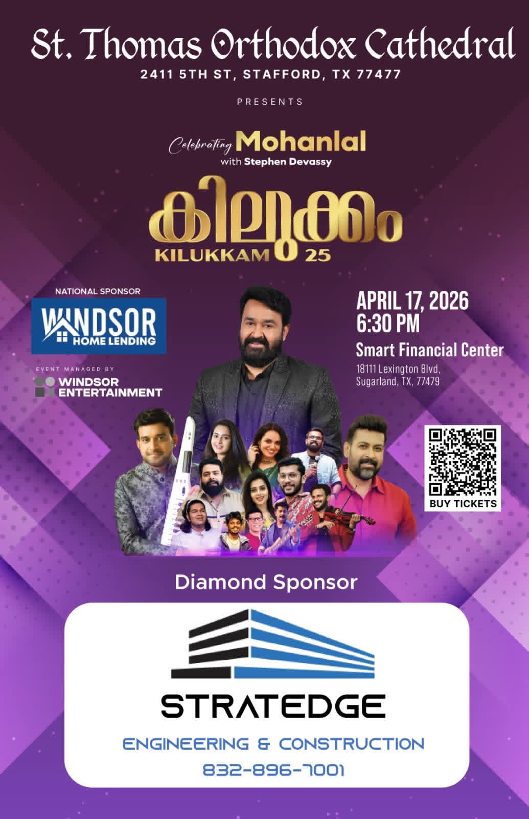 സെന്റ് തോമസ് ഓര്ത്തഡോക്സ് കത്തീഡ്രല് ധനശേഖരണാര്ത്ഥമാണ് ഹൂസ്റ്റന് ഷോ നടത്തുന്നത്. സ്മാര്ട്ട് ഫെനാന്ഷ്യല് സെന്ററില് 5:30 ന് പ്രവേശനം ആരംഭിക്കും. 5 വയസില് താഴെയുള്ള കുട്ടികള്ക്ക് പ്രവേശനം സൗജന്യമായിരിക്കും. നിശ്ചിത എണ്ണം ടിക്കറ്റുകള് ആദ്യമെത്തുന്നവര്ക്ക് കൗണ്ടറില് നിന്നോ ഓണ് ലൈനിലോ വാങ്ങാവുന്നതാണ്.
