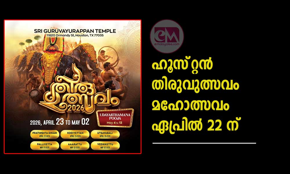 ഹൂസ്റ്റൺ, ടെക്സസ്: ഹൂസ്റ്റൻ ശ്രീ ഗുരുവായൂരപ്പൻ ക്ഷേത്രത്തിൽ പ്രതിഷ്ഠാദിനവും തിരുവുത്സവവും അനുബന്ധിച്ച് നടക്കുന്ന ഉത്സവ മഹോത്സവം ഏപ്രിൽ 22, 2026-ന് ഭക്തിനിറഞ്ഞ അന്തരീക്ഷത്തിൽ ആരംഭിക്കുന്നു. ഈ പുണ്യകർമ്മങ്ങൾക്ക് മുഖ്യ കാർമ്മികത്വം വഹിക്കുന്നത് ബ്രഹ്മശ്രീ കരിയന്നൂർ ദിവാകരൻ നമ്പൂതിരിപ്പാട് ആണ്, ച