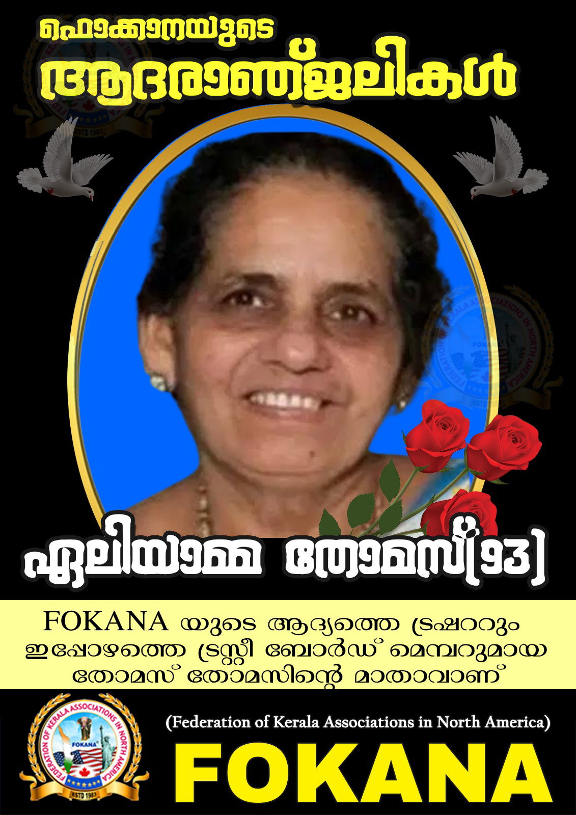 ന്യൂ യോര്ക്ക് : ഫൊക്കാനയുടെ ആദ്യത്തെ ട്രഷററും ഇപ്പോഴത്തെ ട്രസ്റ്റീ ബിര്ഡ് മെമ്പറുമായ തോമസ് തോമസിന്റെ (പാലത്ര) മാതാവ് ഏലിയാമ്മ തോമസിന്റെ നിര്യാണത്തില് ഫൊക്കാന അനുശോജനം രേഖപ്പെടുത്തി.