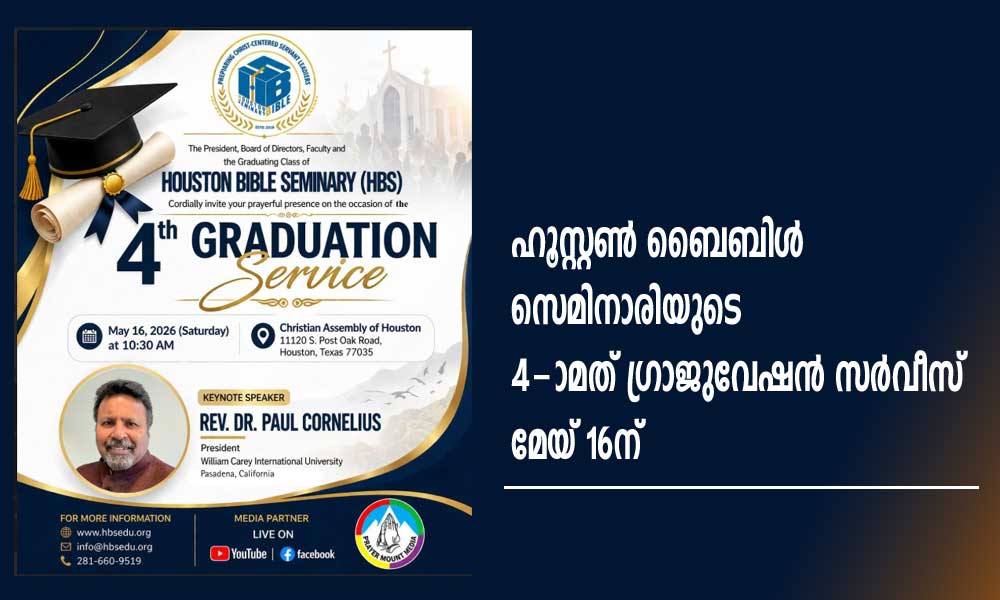 ഹൂസ്റ്റൺ: ഹൂസ്റ്റൺ ബൈബിൾ സെമിനാരി (HBS)യുടെ 4-ാമത് ഗ്രാജുവേഷൻ സർവീസ് മേയ് 16 ശനിയാഴ്ച രാവിലെ 10.30ന് ഹൂസ്റ്റണിലെ ക്രിസ്ത്യൻ അസംബ്ലി ഓഫ് ഹൂസ്റ്റൺ ചർച്ചിൽ (11120 S. Post Oak Road) നടക്കും.