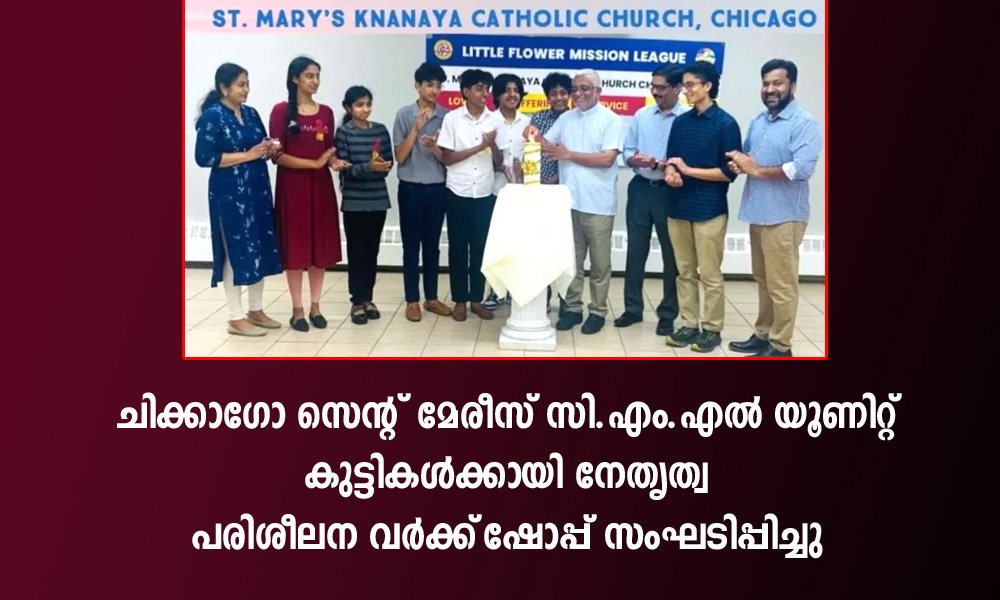 ചിക്കാഗോ: സെൻറ് മേരീസ് ക്നാനായ കത്തോലിക്കാ ദേവാലയത്തിലെ സി.എം.എൽ (CML) യൂണിറ്റിന്റെ നേതൃത്വത്തിൽ കുട്ടികൾക്കായി നേതൃത്വ പരിശീലന വർക്ക്ഷോപ്പ് ഏപ്രിൽ 18-ാം തീയതി ശനിയാഴ്ച വിജയകരമായി സംഘടിപ്പിച്ചു. സി.എം.എൽ എക്സിക്യൂട്ടീവുകൾ, ഗ്രൂപ്പ് ലീഡേഴ്സ്, അസിസ്റ്റന്റ് ലീഡേഴ്സ് എന്നിവർക്ക് വേണ്ടി നടത്തിയ പരിപാടി പങ്കെടുത്ത കുട്ടികൾക്ക് പ്രചോദനകരമായ അനുഭവമായി മാറി. അമേരിക്കയിൽ ഹ്രസ്വ സന്ദർശനത്തിന് എത്തിയ ഡൽഹി-ആഗ്ര രൂപതയിൽ സേവനം അനുഷ്ഠിക്കുന്ന ഫാദർ സുനിൽ കുഴിപ്പറമ്പിൽ പ്രാർത്ഥനയോടെ പരിപാടിക്ക് തുടക്കം കുറിക്കുകയും തുടർന്ന് വർക്ക്ഷോപ്പ് ഉദ്ഘാടനം നിർവഹിക്കുകയും ചെയ്തു.