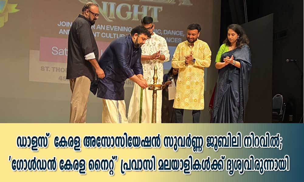 ഡാളസ് : അമേരിക്കയിലെ മലയാളി സംഘടനകളിൽ മുൻപന്തിയിലുള്ള കേരള അസോസിയേഷൻ ഓഫ് ഡള്ളാസ് അതിന്റെ ചരിത്രപരമായ അൻപതാം വർഷത്തിലേക്ക് പ്രവേശിക്കുന്നു. സുവർണ്ണ ജൂബിലി ആഘോഷങ്ങളുടെ (1976-2026) ഭാഗമായി സംഘടിപ്പിച്ച 'ഗോൾഡൻ കേരള നൈറ്റ്' ഗാർലൻഡിലെ സെന്റ് തോമസ് സൈറോ മലബാർ ചർച്ച് ഓഡിറ്റോറിയത്തിൽ ആവേശകരമായി നടന്നു. ഏപ്രിൽ 25 ശനിയാഴ്ച വൈകുന്നേരം നടന്ന ചടങ്ങിൽ ഡള്ളാസിലെ സാമൂഹിക-സാംസ്കാരിക രംഗത്തെ പ്രമുഖരും നൂറുകണക്കിന് പ്രവാസി മലയാളികളും പങ്കെടുത്തു.
